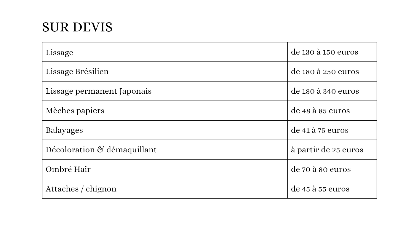 | Shampoing, permanent, brushing, coupe cheveux long | 75 euros |
